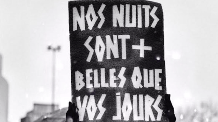 Je pense souvent à cette photo : une pancarte tenue par le queer activist @cuco_pirat ; on lit NOS NUITS SONT PLUS BELLES QUE VOS JOURS. Alors que ce mois des fiertés arrive à son terme, ce texte est un hommage à tous les chats gai-e-s qui ont fait briller mes nuits. (photo Léonard Porcher)